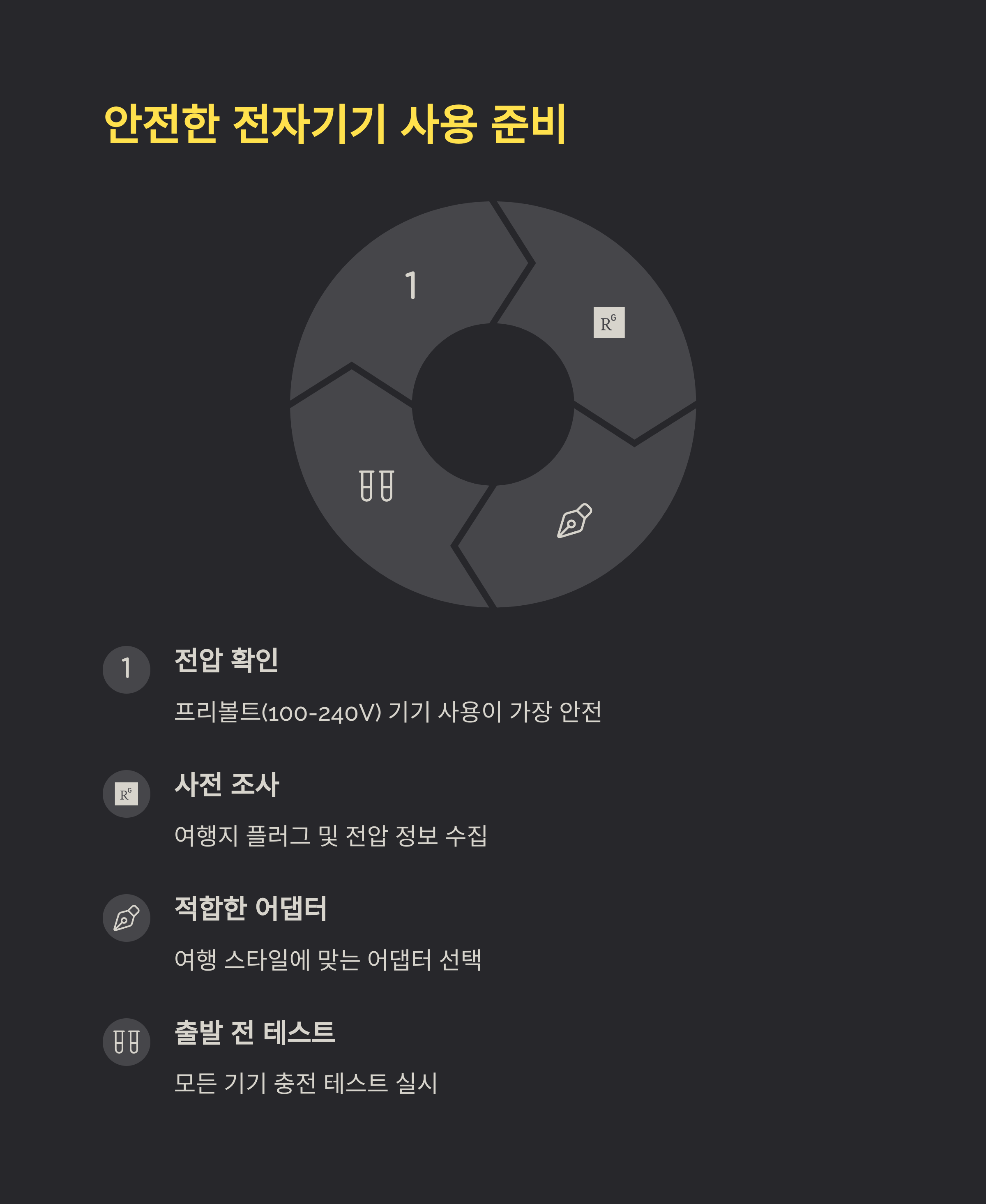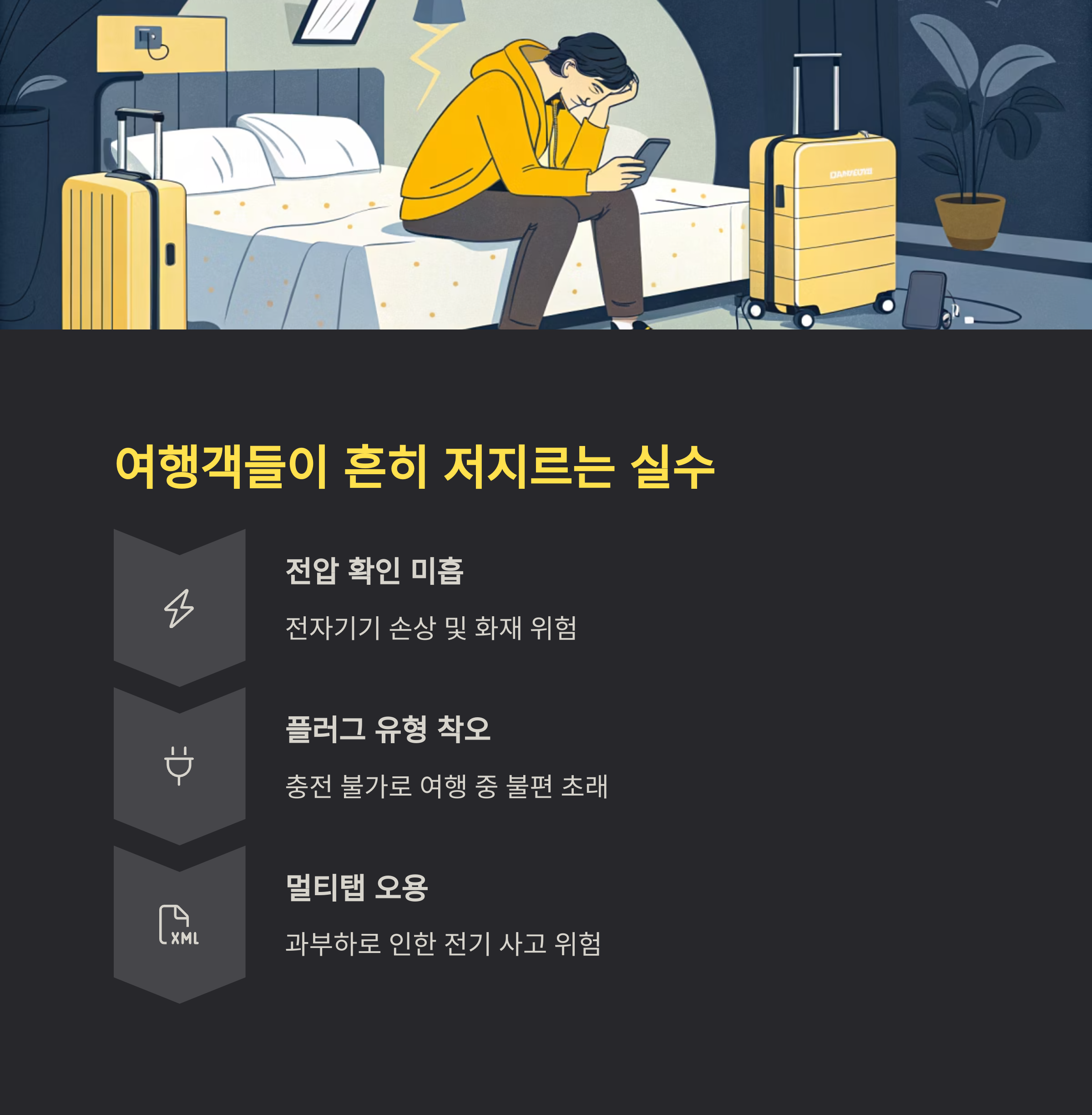 이런 실수는 안전사고나 기기 고장으로 이어질 수 있으니, **여행지별 전압**과 기기 호환 여부를 꼭 사전에 확인하세요. 자세한 플러그/전압 정보는 World Standards에서 확인 가능합니다.