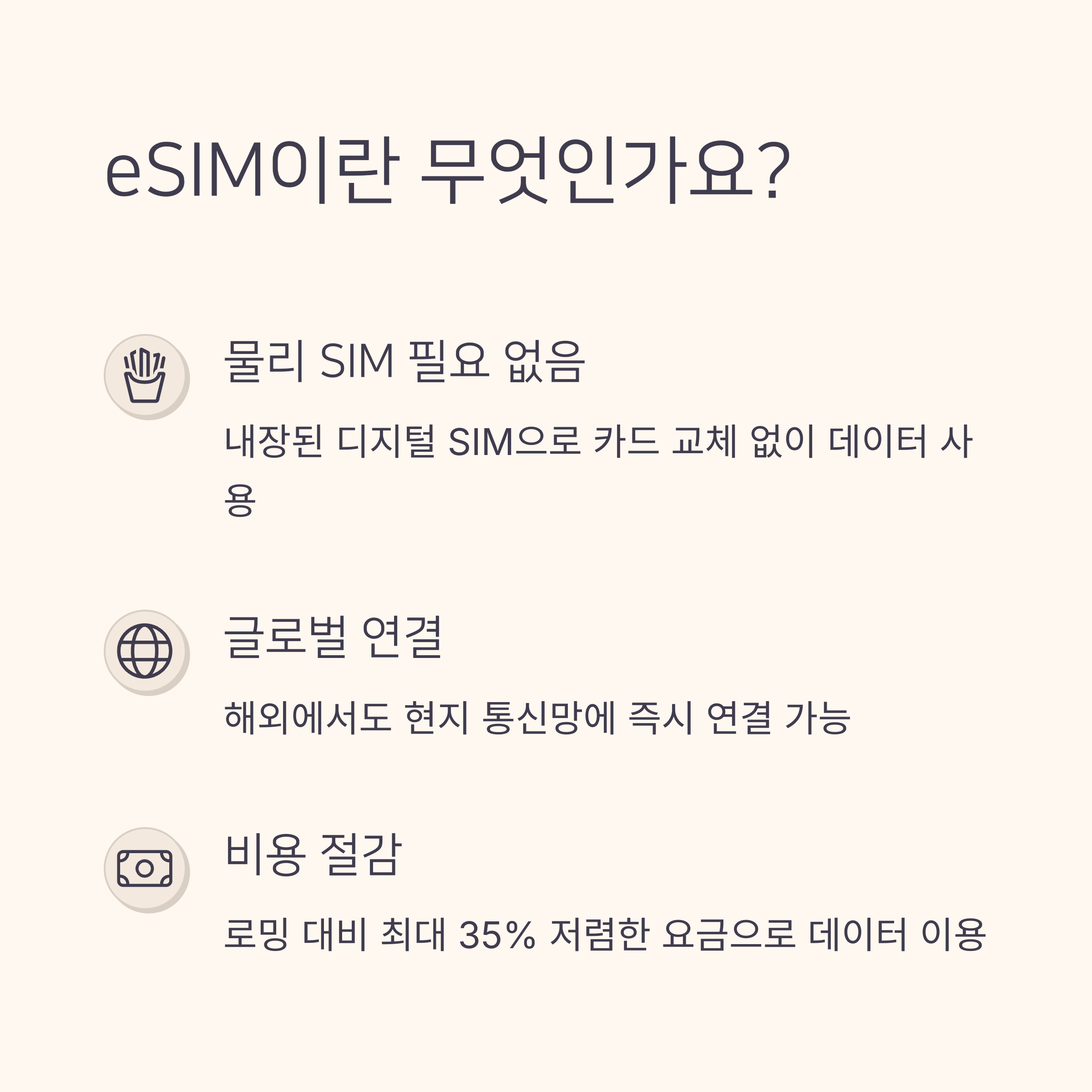 **eSIM**은 'embedded SIM'의 약자로, 스마트폰 등에 내장된 디지털 SIM입니다. 물리적인 SIM을 꽂지 않아도 통신사를 설정할 수 있는 기술이죠. eSIM을 지원하는 기기에서는 QR코드나 프로파일 다운로드만으로 즉시 개통이 가능해 여행 전후 번거로움을 줄여줍니다. 꼭 알아야 할 주요 특징은 다음과 같습니다: